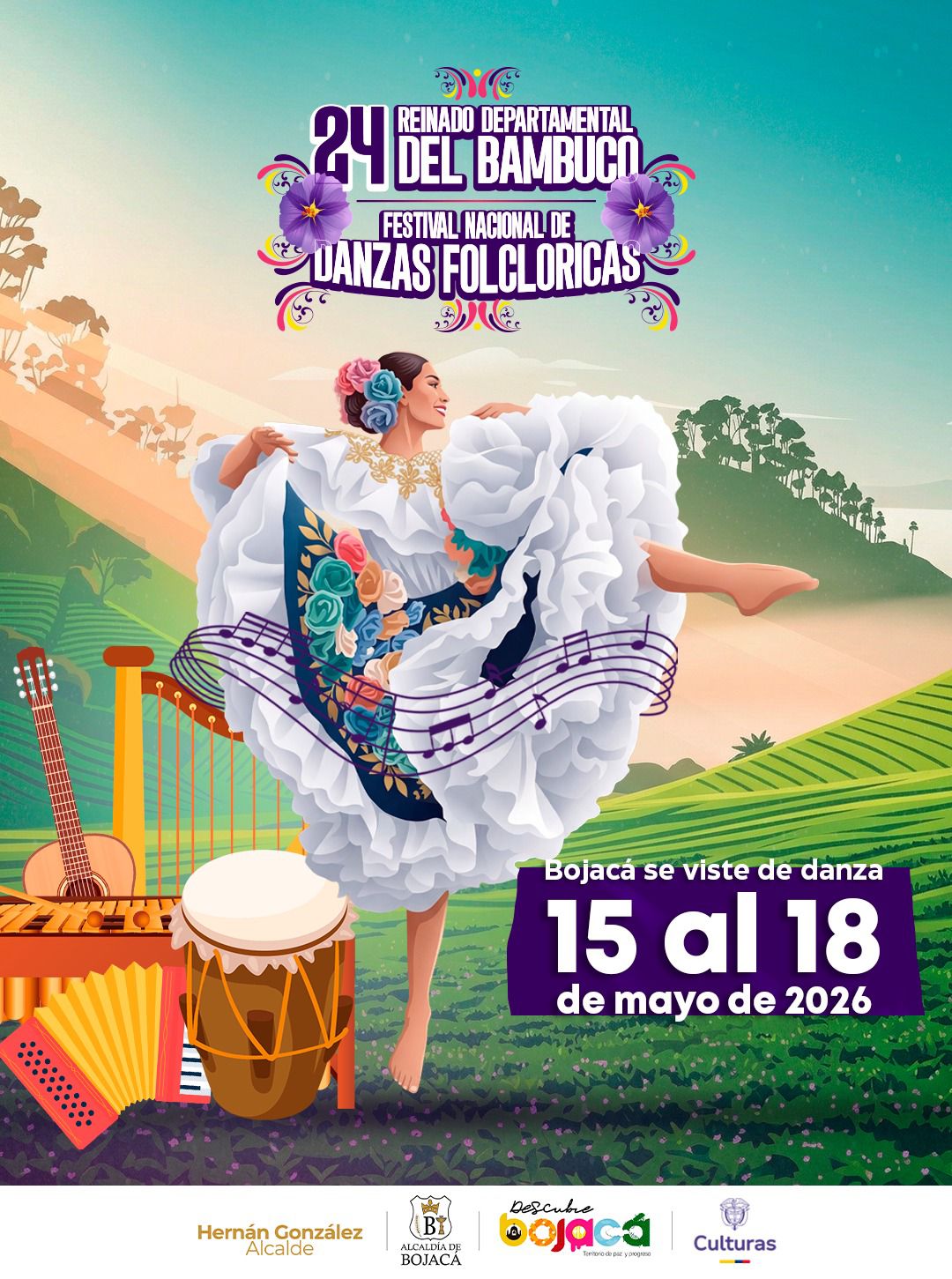 Bojacá, Cundinamarca se viste de danza en la 24° edición del Reinado Departamental del Bambuco y el Festival Nacional de Danzas Folclóricas que se llevará a cabo del 15 al 18 de mayo de 2026. Una tradición que exalta el talento artístico cundinamarqués y la identidad cultural del país.