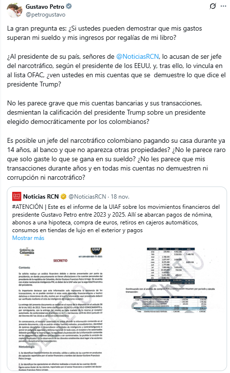 Posteriormente y como se puede constatar en el informe, el presidente Petro también enfatizó por la misma red social, que las acusaciones en su contra sobre supuestos vínculos con actividades del narcotráfico, no corresponden con la situación económica que se describe en sus movimientos financieros, resultando paradójico que sea incluido en la lista OFAC, más conocida como lista Clinton: