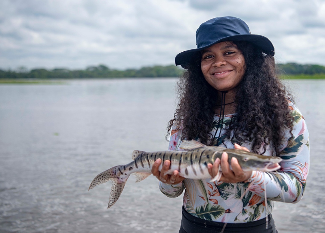 Yuvelis Morales Blanco, de 24 años, creció a orillas del río Magdalena, en la comunidad afrocolombiana de Puerto Wilches, en una familia de pescadores artesanales. De niña, recuerda Yuvelis, “no teníamos nada más que el río; ella era como una madre que me cuidaba”. Creciendo, vio cómo la pesca de su padre—y el sustento de su familia—disminuía debido a los frecuentes derrames de petróleo en el río. Recordando los derrames de petróleo, Yuvelis señala que “las manchas oscuras en el río significaban que no íbamos a comer”.