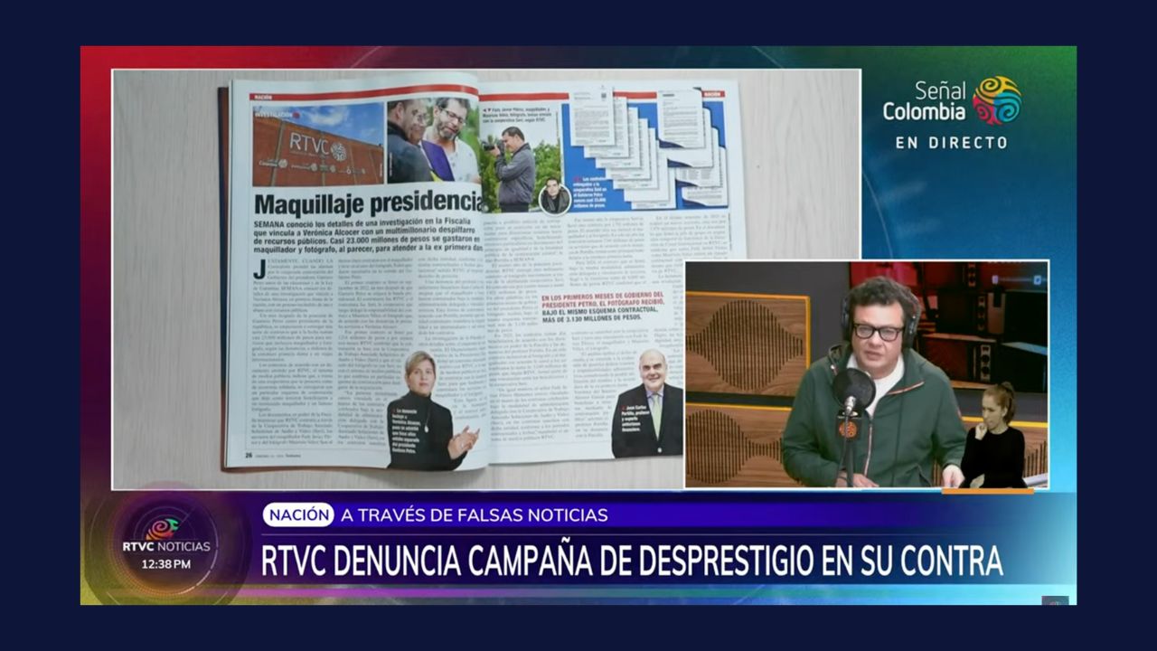 RTVC Noticias abrió su emisión de medio día de este domingo con una denuncia sobre una campaña de desprestigio y desinformación que, según la gerencia, busca golpear al sistema de medios públicos y al Gobierno Nacional. Esto a partir de una publicación de la Revista Semana que presentó como gasto individual en “maquillaje y fotografía” una cifra de 23.000 millones de pesos de un contrato entre RTVC y el Departamento Adminstrativo de la Presidencia -DAPRE-.