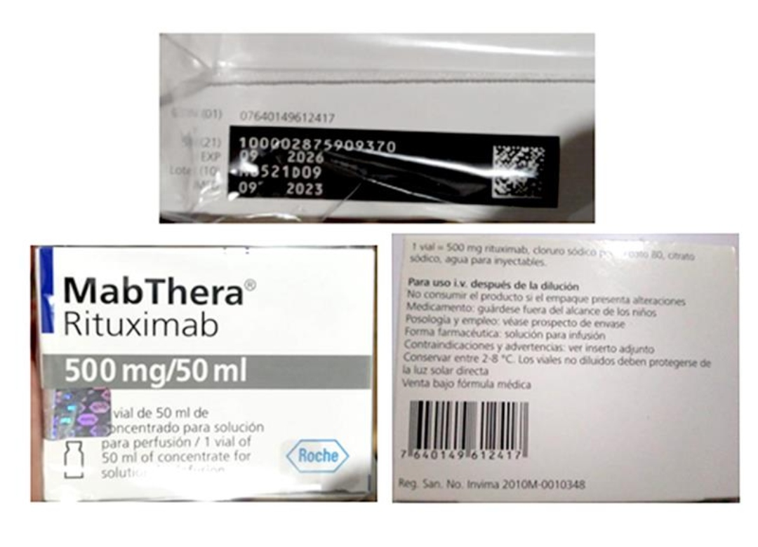 El Invima comenzó a alertar a la ciudadanía por la falsificación del medicamento MABTHERA CONCENTRADO PARA INFUSIÓN 500 mg/50mL, lote M8521D09, con fecha de manufactura 09-2023 y fecha de expiración 09-2026, que es usado para tratamientos contra diferentes tipos de cáncer y enfermedades del sistema inmune.