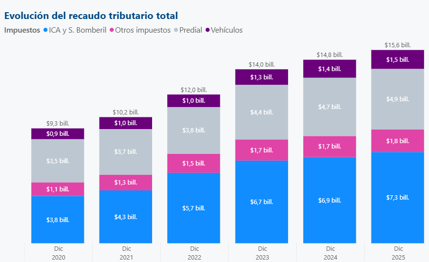 En el gráfico se observa que el impuesto que más genera recursos es el de industria y comercio (ICA), que pasó de un recaudo de menos de 4 billones en 2020, a uno de 7.3 billones en 2025. El siguiente tributo en orden de importancia es el predial, que permitió pasar de 3.5 billones en 2020 a 4.9 billones en este último año.