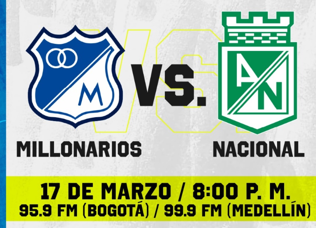 La Radio Nacional de Colombia transmitirá el partido de este martes 17 de marzo entre Millonarios y Nacional a partir de las 8 de la noche en directo por sus 74 frecuencias con los relatos de Alfredo Matiz y los comentarios y datos de Julián Capera y Ana María Sánchez.