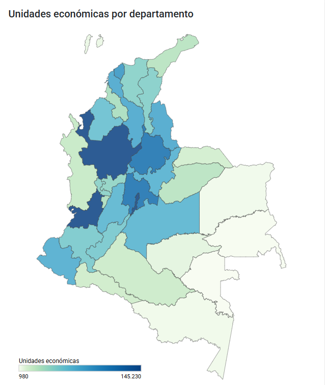 La información está organizada por departamentos y municipios, como se puede observar en el siguiente mapa publicado por la entidad, en el que se observa que los territorios en que más se encuentran unidades económicas son los que tienen mayor densidad de población: Bogotá, Antioquia y Valle del Cauca.