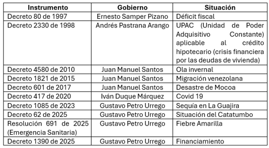 En la siguiente tabla se presenta el resumen del uso de la emergencia económica como mecanismo de excepción en el país. Debe mencionarse que la Corte Constitucional se ha pronunciado en contra de la declaración en el caso del gobierno de Samper y con el decreto de La Guajira, durante el mandato del presidente Gustavo Petro.