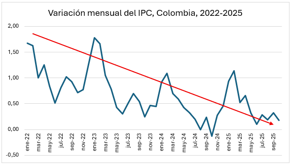 Durante el periodo presidencial de Gustavo Petro, la inflación ha mostrado una tendencia a la baja, como se describe en la línea roja de la primera gráfica. Esto significa que no se han encarecido los bienes y servicios disponibles en los mercados colombianos.