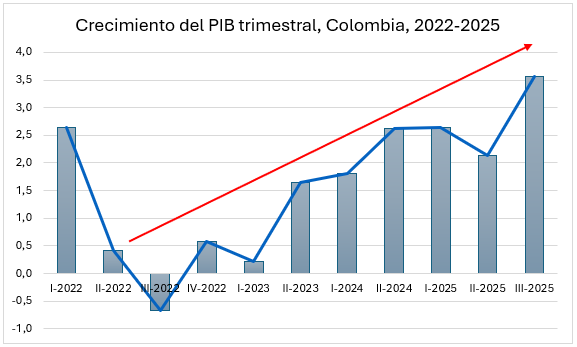 Simultáneamente, en la economía colombiana se producen cada vez más bienes y servicios, como se muestra en el segundo gráfico, mediante la línea roja. De esta forma, los datos permiten verificar que, en el país, hay una mayor oferta de productos a precios más accesibles, a medida que pasa el tiempo, dentro del lapso observado.