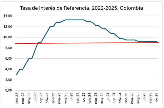 Luego, fue reducida paulatinamente en cuatro puntos porcentuales, para ser estabilizada en 9.25% desde mayo de 2025, por lo que ya lleva siete meses en el mismo valor. En este gráfico, la línea roja demarca el nivel 9%, por debajo del cual, no se ha permitido que se reduzca el valor de dicha tasa.