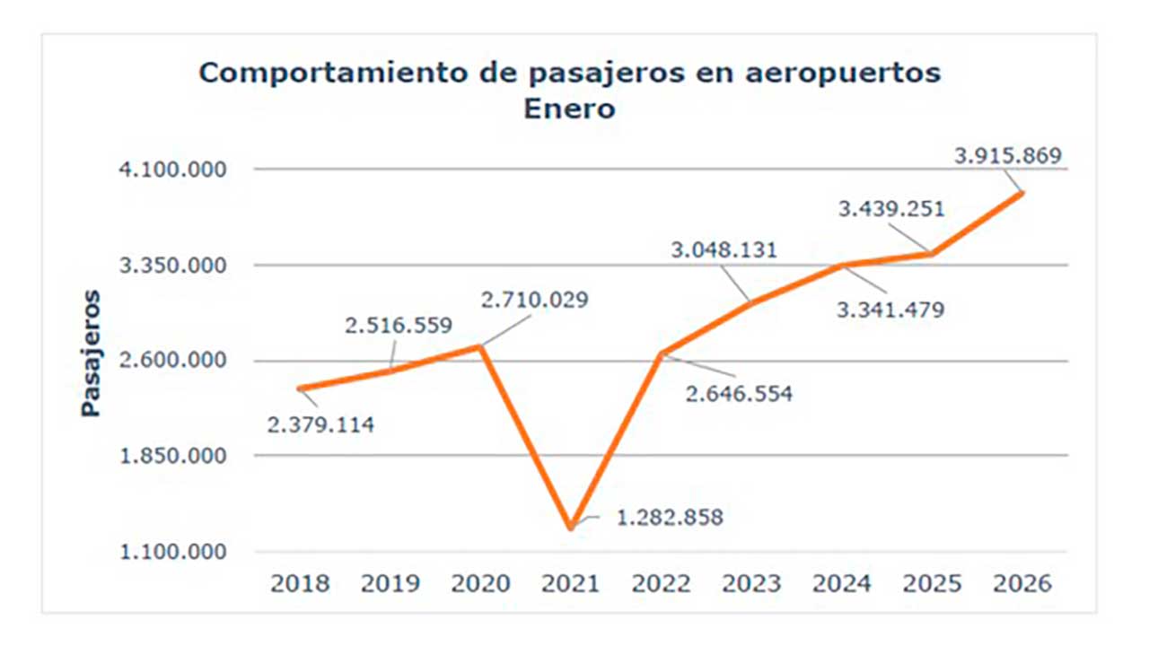 Según la entidad, durante el primer mes del año se movilizaron 3.915.869 pasajeros y 96.287 toneladas de carga mediante las principales infraestructuras concesionadas, lo que representa incrementos del 15 % y 23 %, respectivamente, frente al mismo periodo de 2025.