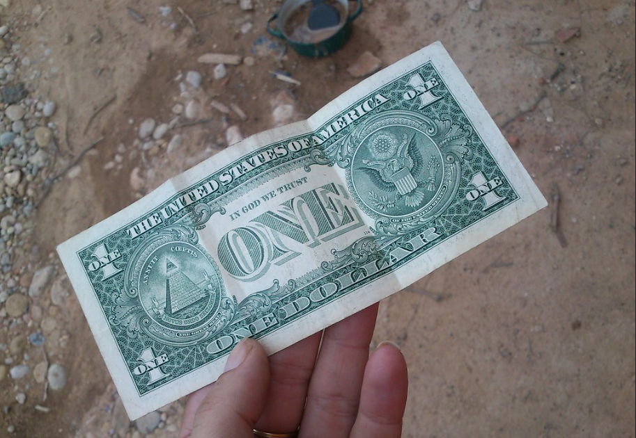 billete de un dólar sostenido por una mano, fondo piso de tierra
