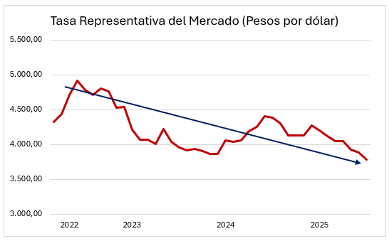 La reducción de $1142 en tres años (de noviembre 2022 a noviembre 2025) corresponde a un índice del -23%, el cual refleja que el comercio exterior colombiano está respondiendo a las señales de precios internacionales e incluso, ajustándose a procesos más diversificados hacia nuevos mercados. La progresividad del cambio y el fortalecimiento de indicadores como la inversión y consumo dentro del país, evidencian que el sistema productivo se ha ido acoplando a la nueva situación de la moneda.