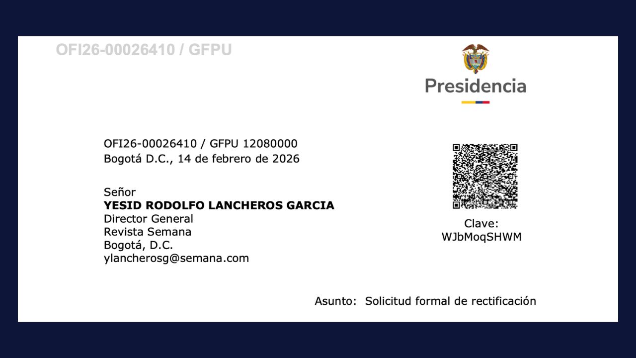 La Presidencia de la República emitió un comunicado oficial, en el que formalizó una solicitud de rectificación dirigida a Semana con base en el artículo 20 de la Constitución. En el oficio, la Coordinación del Grupo de Comunicaciones Estratégicas y Digitales sostiene que el titular y el desarrollo de la nota instalaron una cifra que no corresponde a pagos individuales y que, además, ponen en riesgo derechos como el buen nombre y la honra de personas e instituciones.